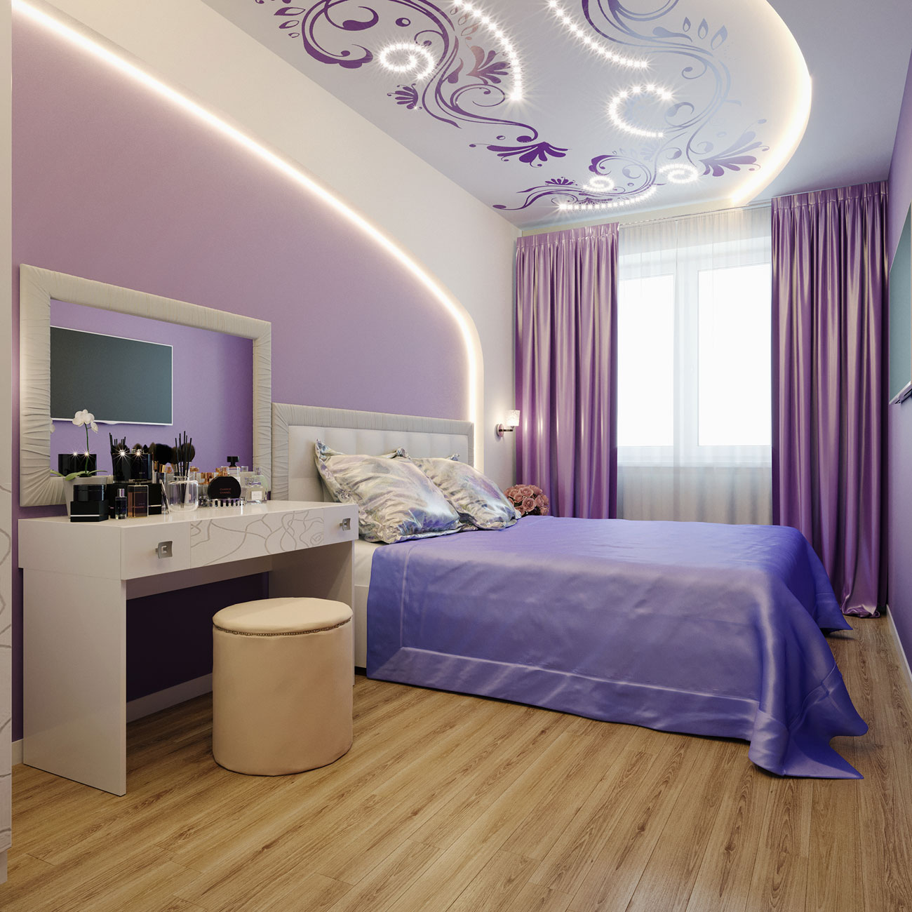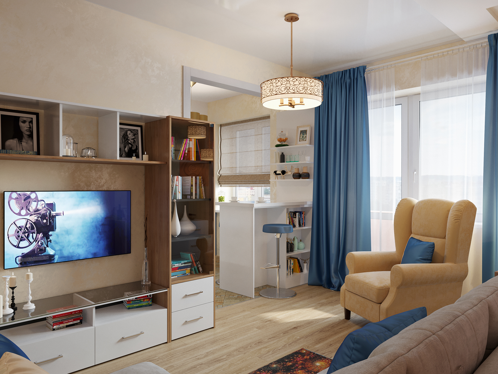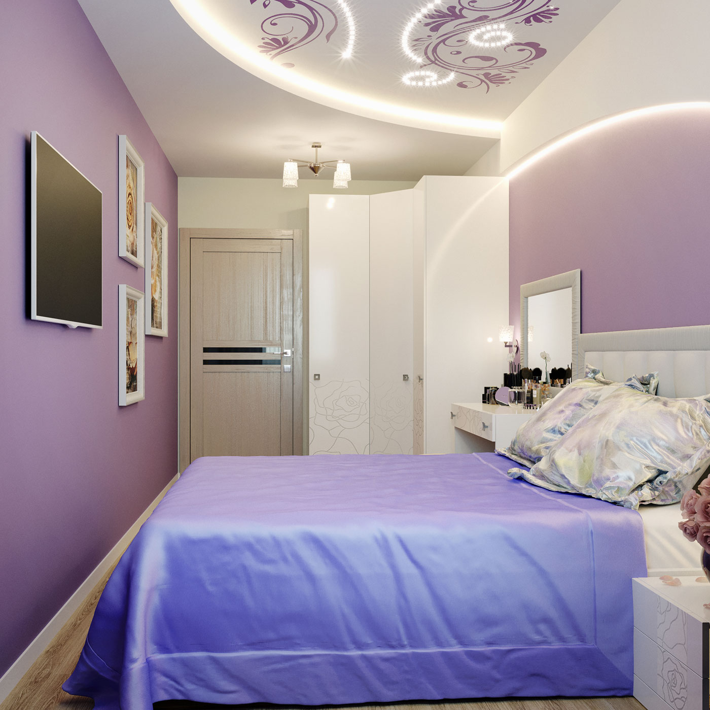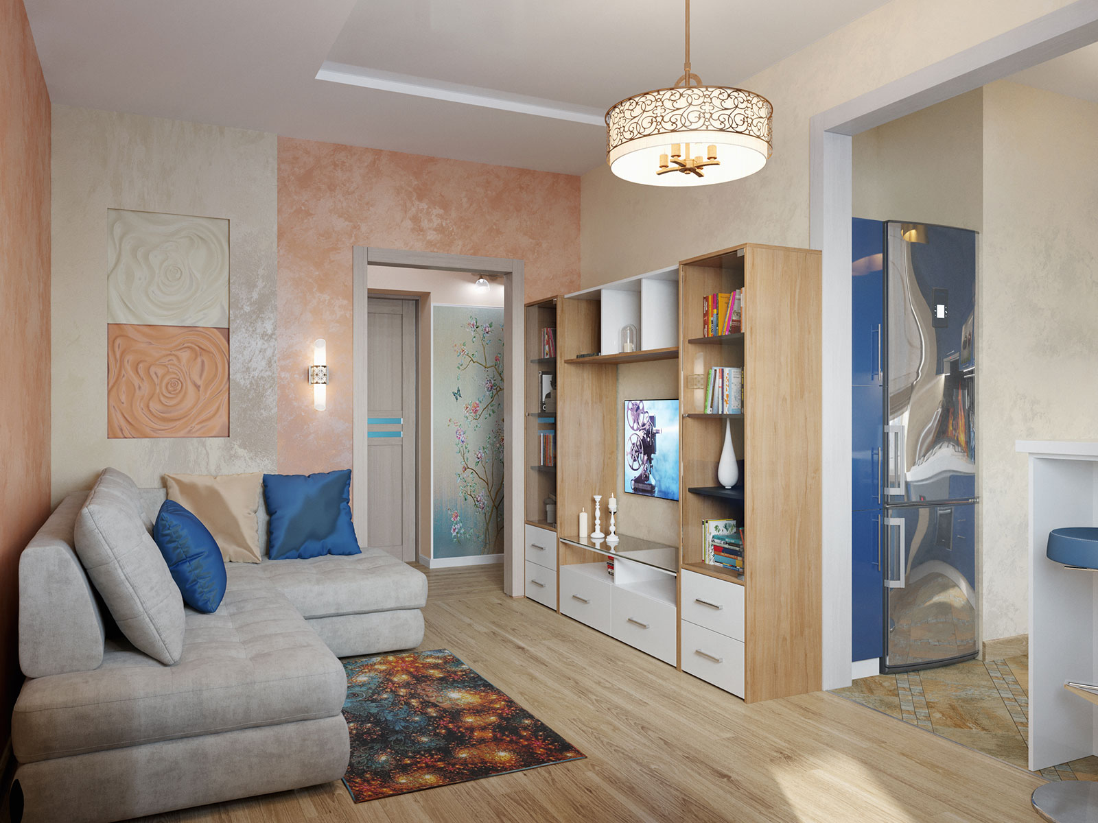 Как на небольшой площади разместить все необходимое? Очень часто хозяева квартиры боятся перепланировки и делают ремонт, исходя из того что есть. В этом случае владелица согласилась на перепланировку, что позволило выделить несколько полезных пространств и в принципе увеличить жилое пространство квартиры.Благодаря грамотному планировочному решению в прихожей разместился комод для обуви, вешалка для верхней одежды и большое зеркало.Интерьер отображает внутренний мир владелицы квартиры.Прихожая выполнена в светлых классических кремовых оттенках, но на стене напротив зеркала размещается чудесное панно, под стиль китайского шелкового платка. Голубые и бирюзовые переливы, на фоне которых изображены нежные, разноцветные бабочки, создают ощущение легкости и воздушности. Гостиная совмещена с кухней. Стены в гостиной отделаны под белый и розовый мрамор.В гостинной расположился угловой диван светло-серого цвета с яркими подушками и вместительный мебельный гарнитур.За мебельным гарнитуром организован проход на кухню. На границе с гостиной организована барная стойка.Сама кухня также выполнена в насыщенно синем цвете. Кухонный фартук выполнен из закаленного стекла и изображает войну огня и льда. Вместительный кухонный гарнитур с множеством шкафов и мест для хранения. Рабочая зона для увеличения полезного пространства продлевается на подоконник. Кухня оборудована всей необходимой техникой. Ванна выполнена в двух оттенках. Ярко синем, васильковом и белоснежном цветах. Спальня выполнена в лилово-сиреневых оттенках. Рядом с кроватью размещается белый туалетный столик с зеркалом. Напротив кровати стена полностью выкрашена в лиловый цвет и на ней размещен телевизор и дизайнерские панно и картины.
