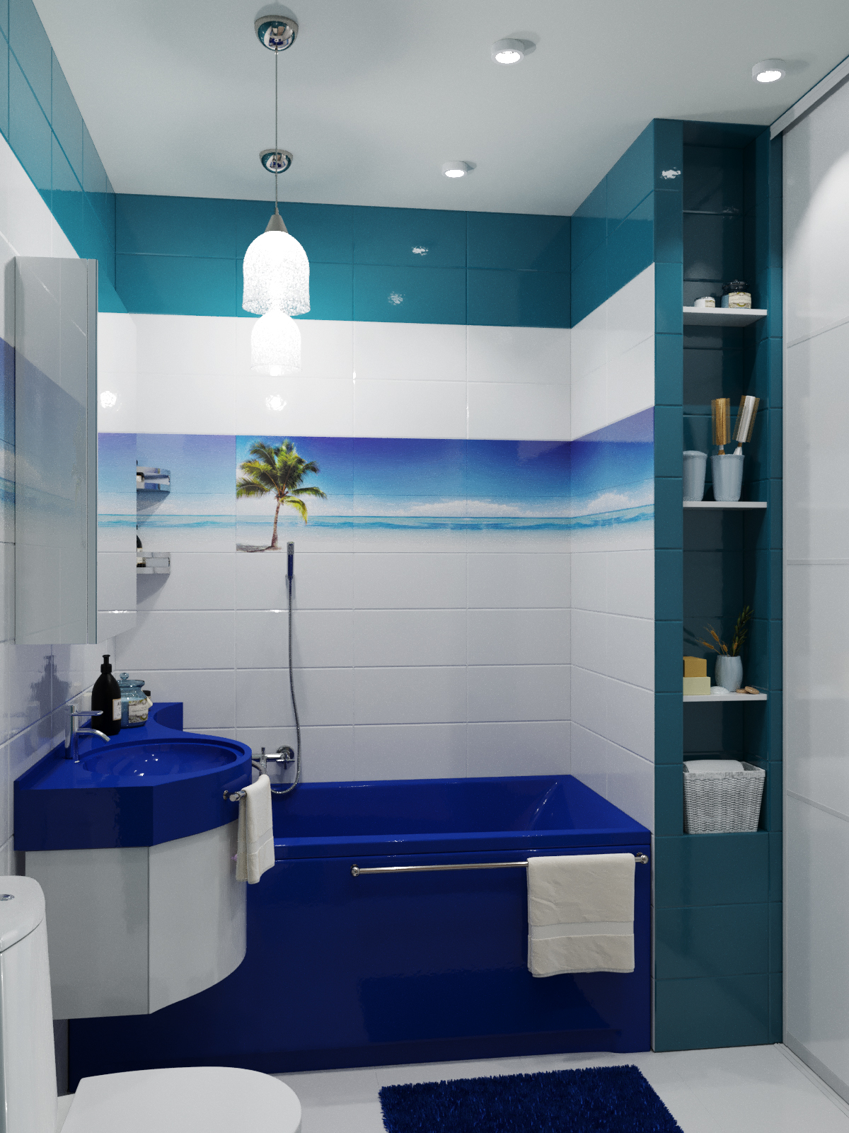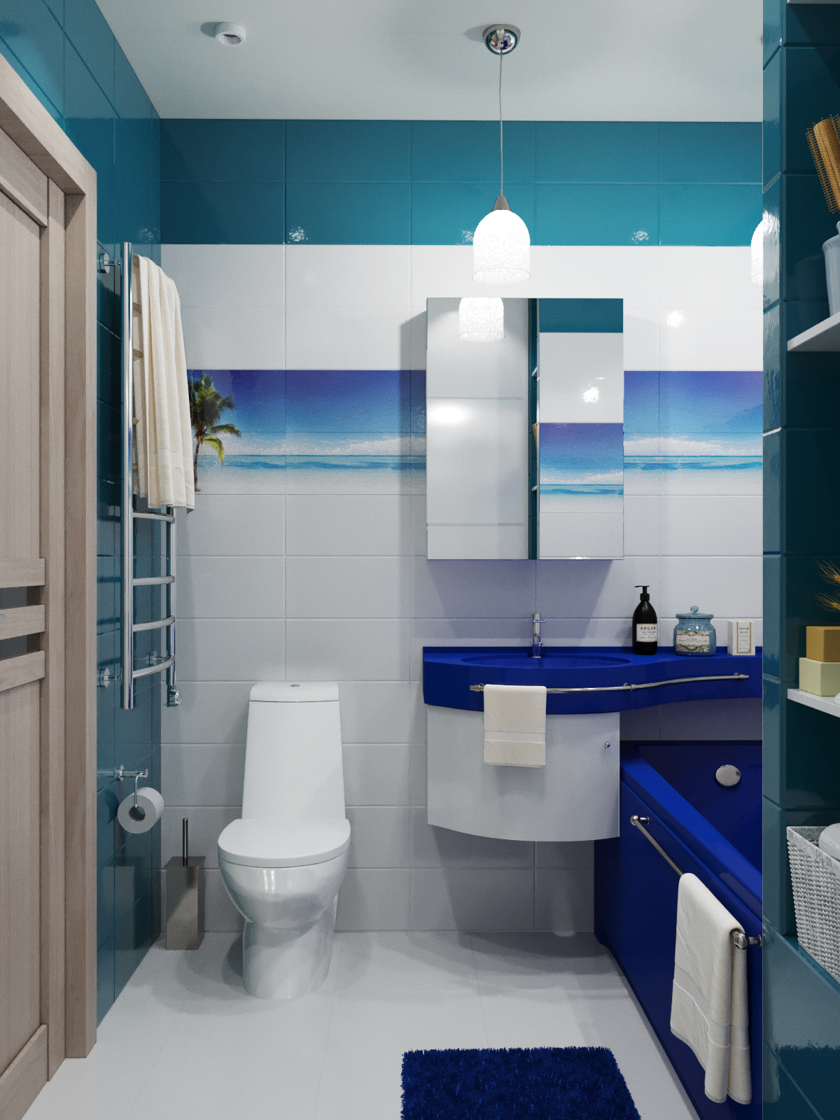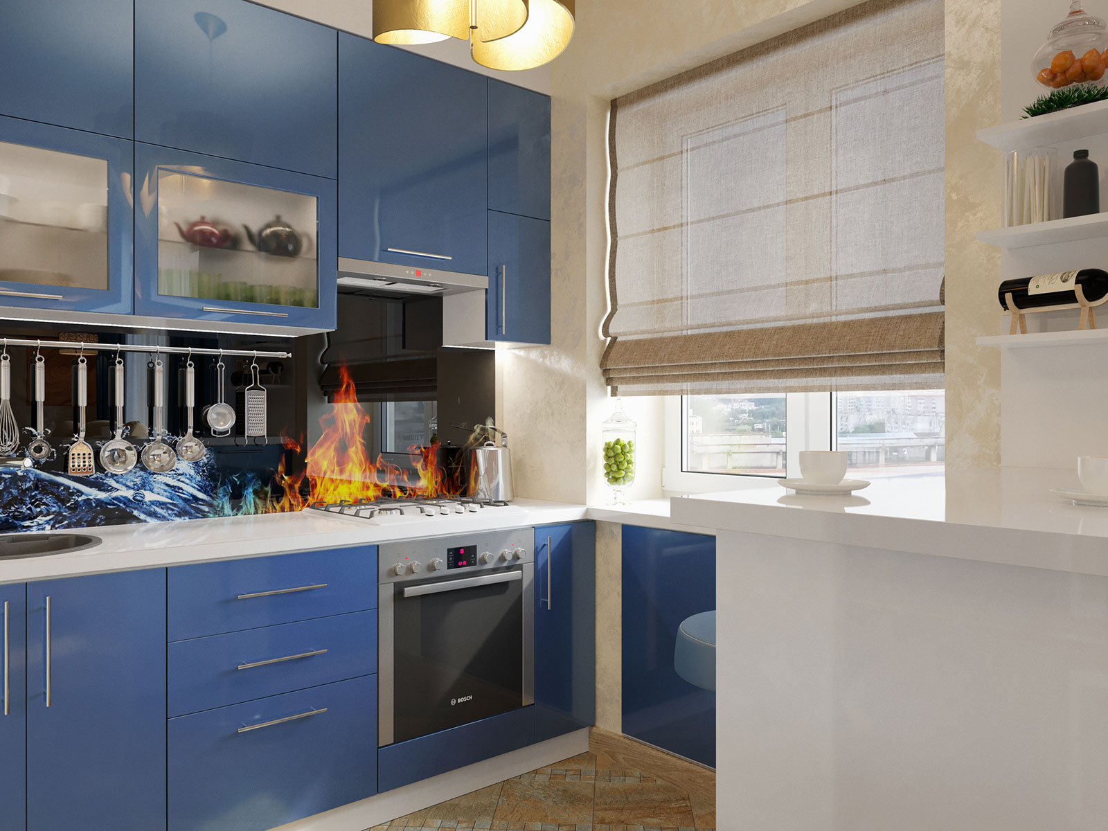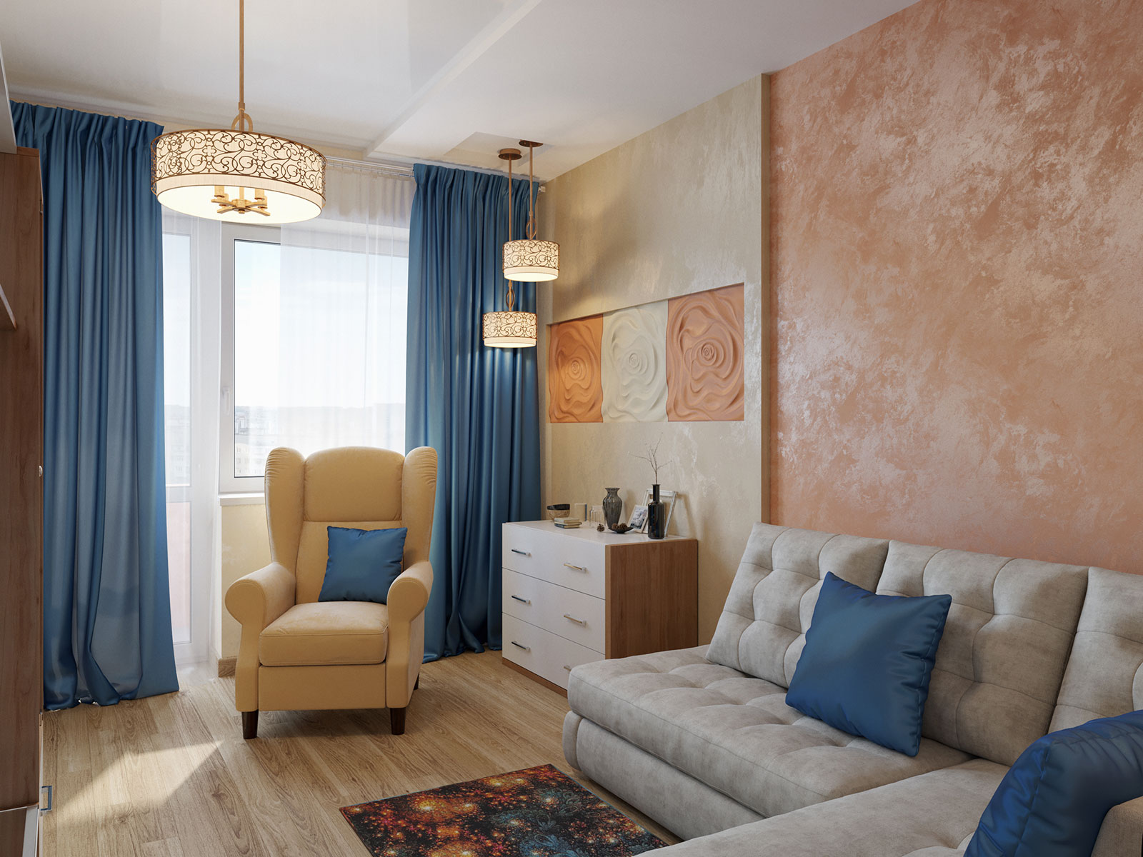 Как на небольшой площади разместить все необходимое? Очень часто хозяева квартиры боятся перепланировки и делают ремонт, исходя из того что есть. В этом случае владелица согласилась на перепланировку, что позволило выделить несколько полезных пространств и в принципе увеличить жилое пространство квартиры.Благодаря грамотному планировочному решению в прихожей разместился комод для обуви, вешалка для верхней одежды и большое зеркало.Интерьер отображает внутренний мир владелицы квартиры.Прихожая выполнена в светлых классических кремовых оттенках, но на стене напротив зеркала размещается чудесное панно, под стиль китайского шелкового платка. Голубые и бирюзовые переливы, на фоне которых изображены нежные, разноцветные бабочки, создают ощущение легкости и воздушности. Гостиная совмещена с кухней. Стены в гостиной отделаны под белый и розовый мрамор.В гостинной расположился угловой диван светло-серого цвета с яркими подушками и вместительный мебельный гарнитур.За мебельным гарнитуром организован проход на кухню. На границе с гостиной организована барная стойка.Сама кухня также выполнена в насыщенно синем цвете. Кухонный фартук выполнен из закаленного стекла и изображает войну огня и льда. Вместительный кухонный гарнитур с множеством шкафов и мест для хранения. Рабочая зона для увеличения полезного пространства продлевается на подоконник. Кухня оборудована всей необходимой техникой. Ванна выполнена в двух оттенках. Ярко синем, васильковом и белоснежном цветах. Спальня выполнена в лилово-сиреневых оттенках. Рядом с кроватью размещается белый туалетный столик с зеркалом. Напротив кровати стена полностью выкрашена в лиловый цвет и на ней размещен телевизор и дизайнерские панно и картины.