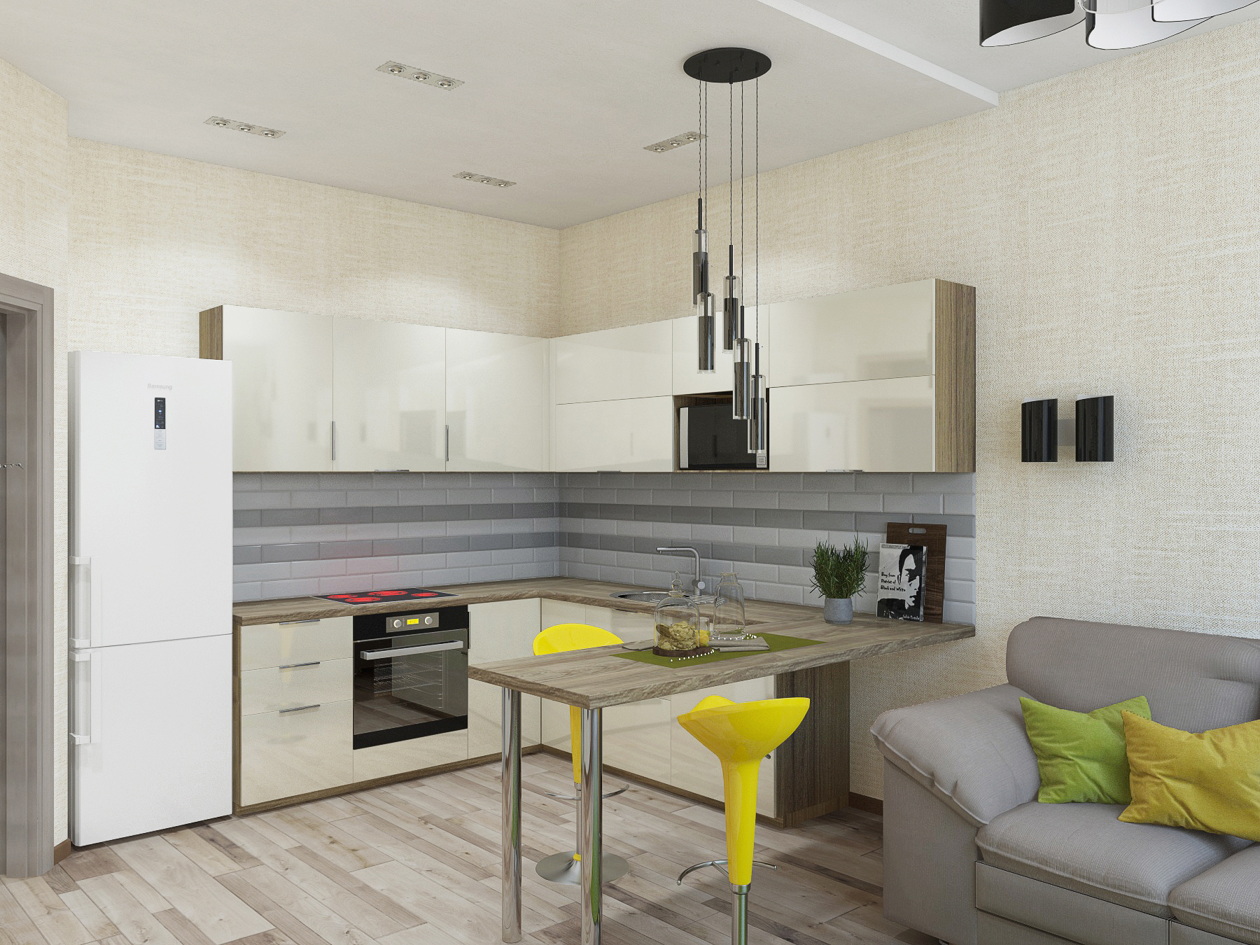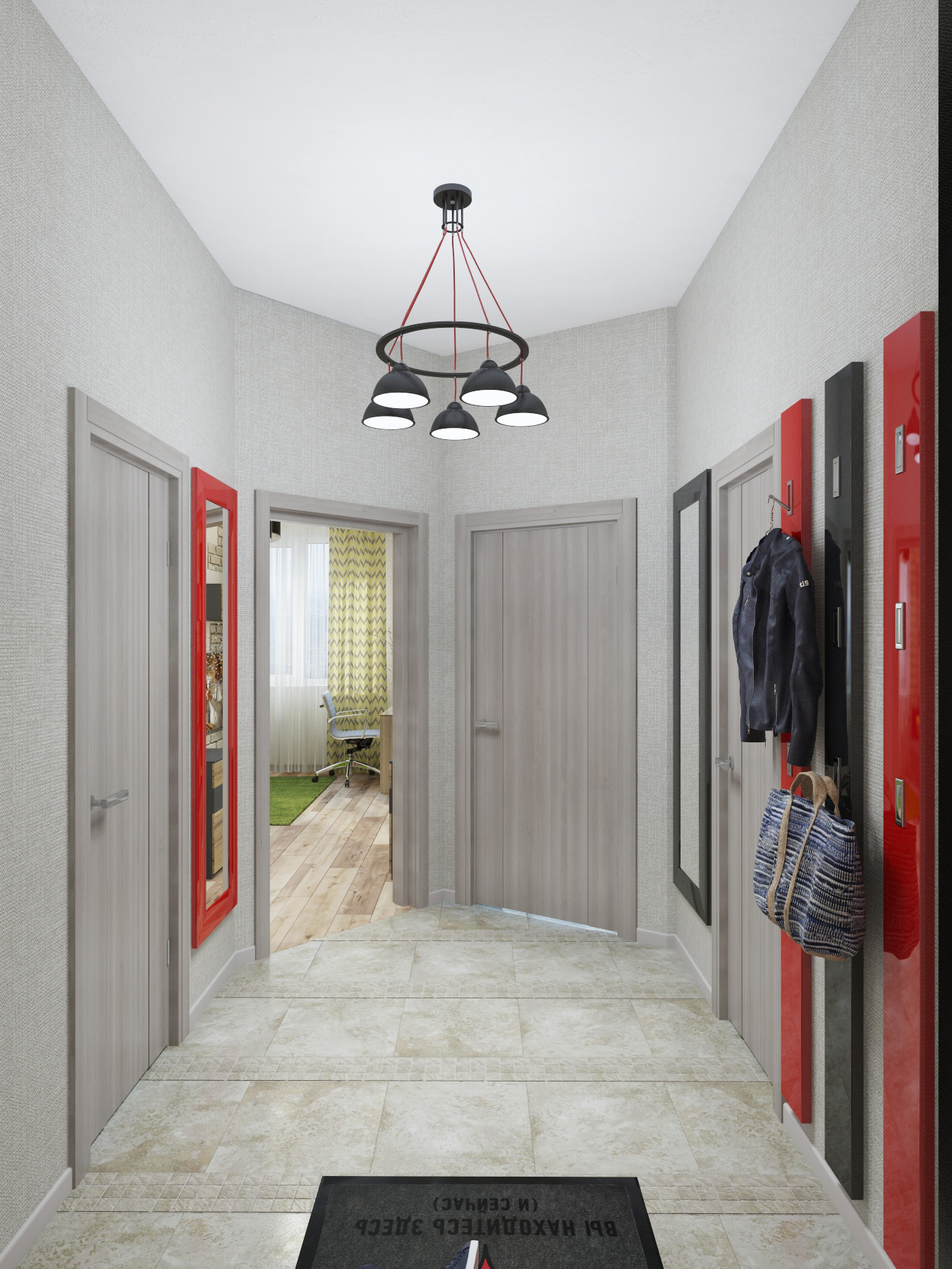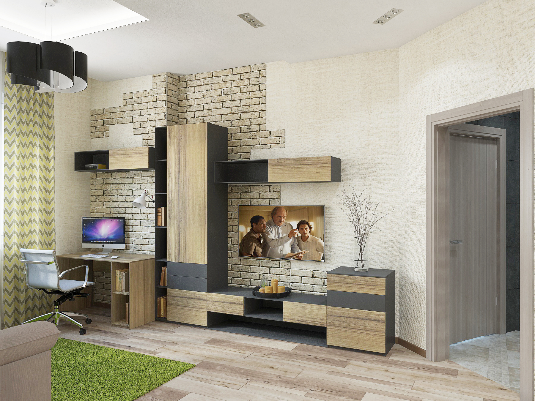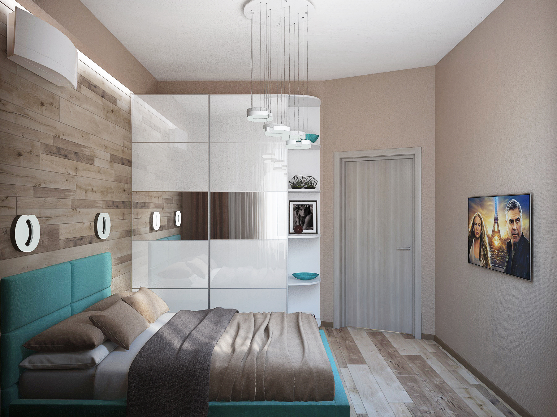 Изготовление мебели по индивидуальным размерам внесло свой вклад в формирование интерьера.Современный темп жизни требует активности. Однако приходя домой нам всем хочется расслабиться и слиться с природой. Такое возможно при использовании в дизайне интерьера эко-стиля.В данной квартире прихожая выполнена в светло-серых тонах с ярко-красными акцентами. Максимально природные материалы и расцветки. Пол выполнен под камень, на дверях отчетливо виден рисунок древесины. На потолке лаконичная черная люстра с несколькими светильниками.Комната совмещает в себе сразу два пространства – это кухню и гостиную. Около входа расположилась кухонная зона.Кухонный гарнитур натурального оттенка под молочный мрамор. Рабочая зона плавно продлевается в деревянную барную стойку. Кухонный фартук выполнен из современной плитки серого цвета. Стены в комнате покрыты текстильными обоями молочного цвета. Стена напротив дивана выложена камнем.Мебель в данном проекте изготавливалась по индивидуальным размерам, что значительно облегчило работу дизайнерам и дало больше свободы в решениях, поскольку не были ограничены стандартными размерами, которые надо было бы уместить на небольшой площади и не загромоздить при этом пространство. Спальня выполнена в современном стиле. Пол выложен ламинатом под состаренное дерево и этот же ламинат продолжается на стену за изголовьем кровати. Создается впечатление, будто комната расположена в центре дерева. Рядом со шкафом стоит двуспальная кровать необычного цвета морской волны с мягким изголовьем.