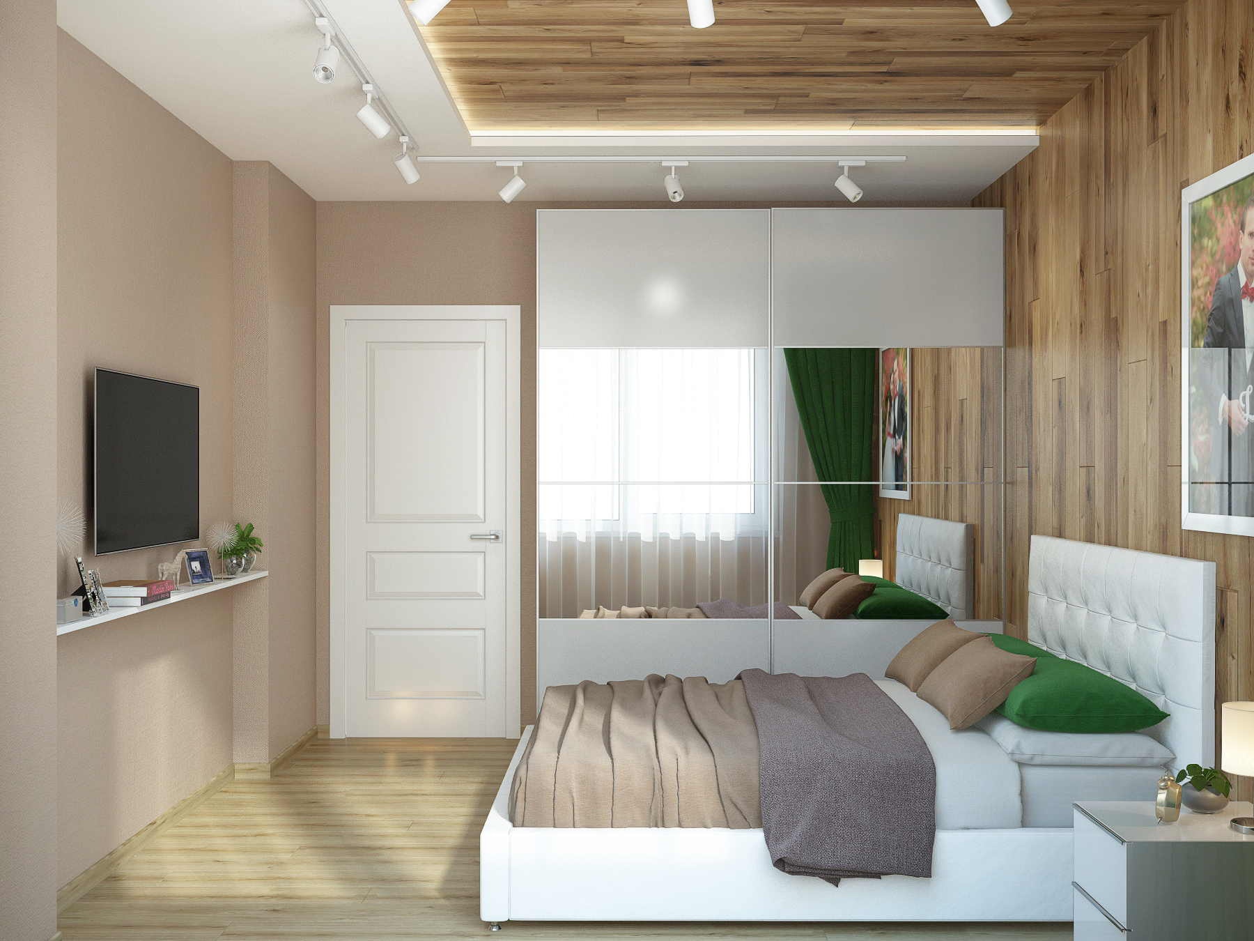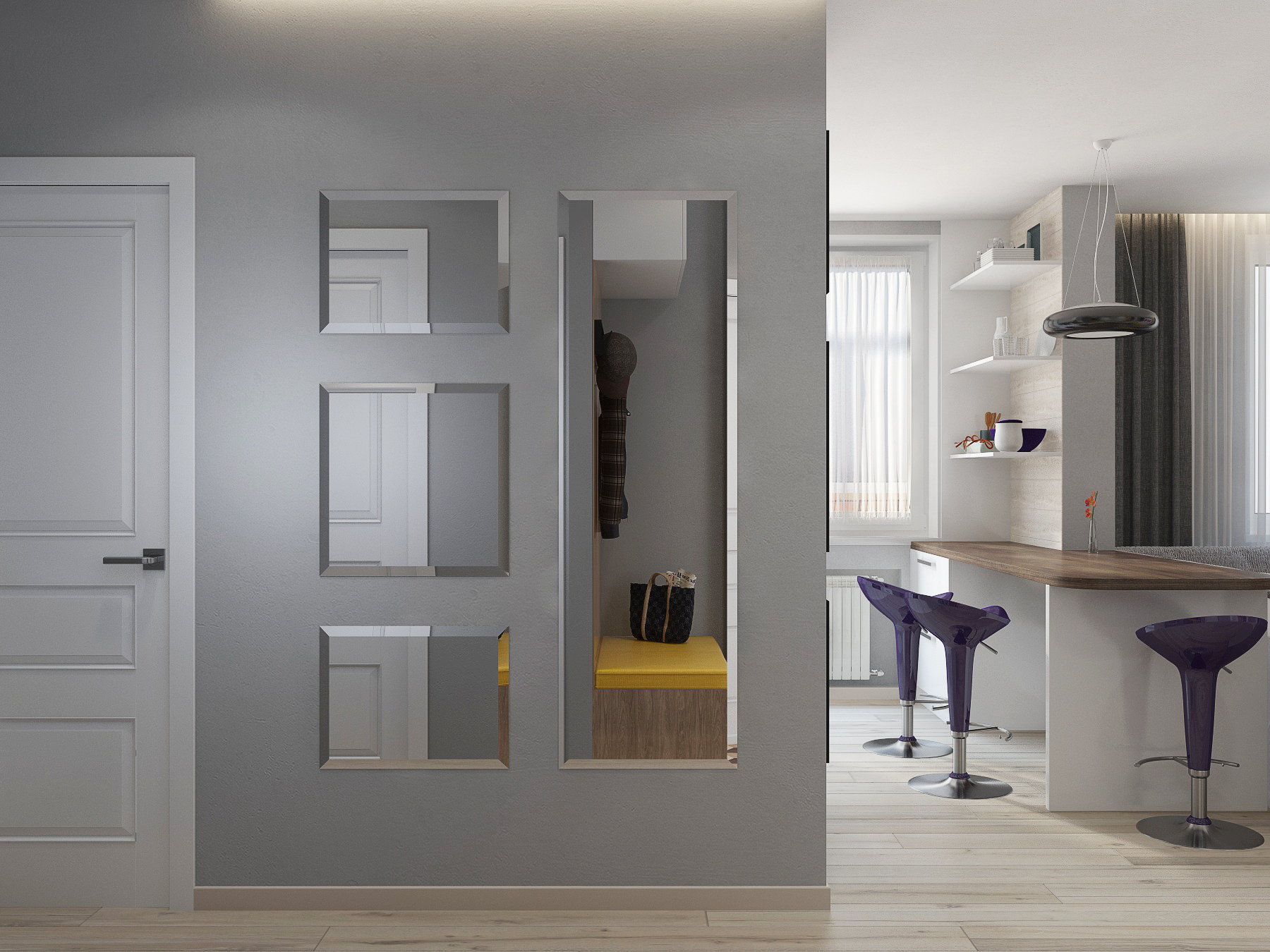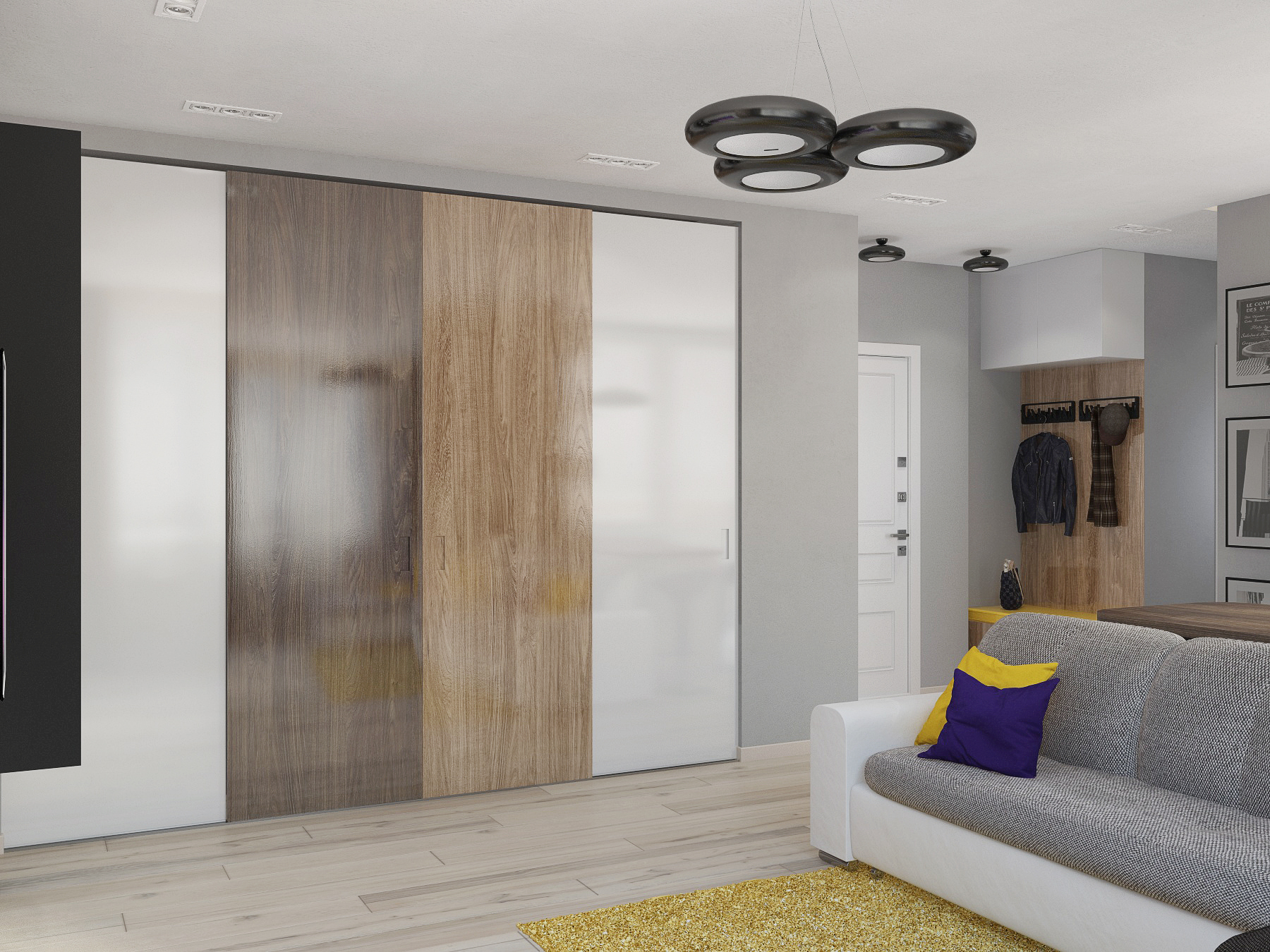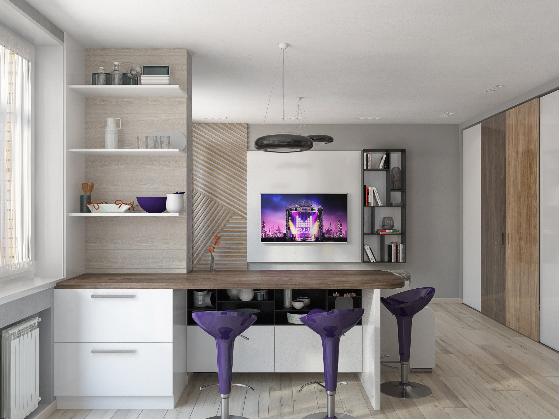 Небольшая по площади квартира — очень функциональна: кухня-студия с полноценной рабочей зоной, комфортным диваном и вместительным стильным шкафом-купе; спальня, оформленная в актуальном эко-стиле; два санузла- один с ванной, второй выступает в роли постирочной; при входе выделено место под открытые вешалки и хранение обуви. Комбинация светлых стен с напольным покрытием теплых древесных оттеков, акценты в виде деревянных реек, зеркал, плитки в форме «кабанчика» создают непринужденную атмосферу современной квартиры, где можно пообщаться с друзьями и расслабиться в компании друг друга.